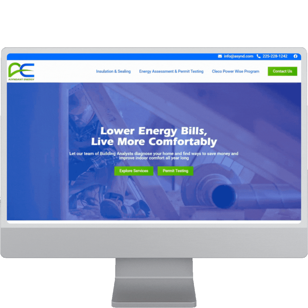 Asyndant Energy is a Louisiana-based home performance company that helps homeowners improve comfort, reduce energy waste, and lower utility costs through energy assessments and weatherization services. Before partnering with Carlin Studios, their website was dated, difficult to navigate, and wasn’t effectively generating new leads or communicating the real-world value of their services to everyday homeowners.